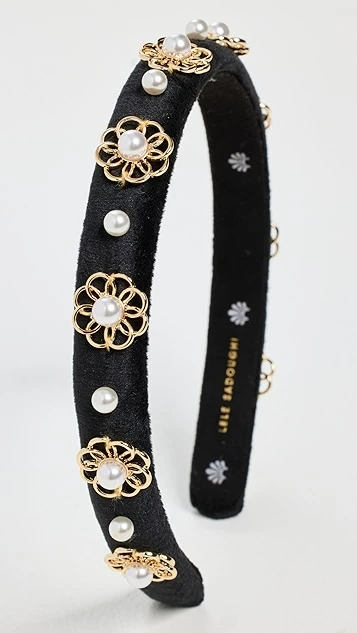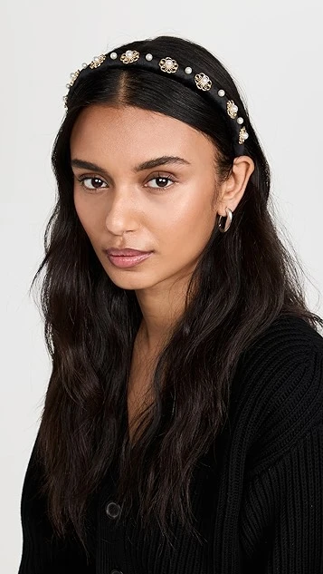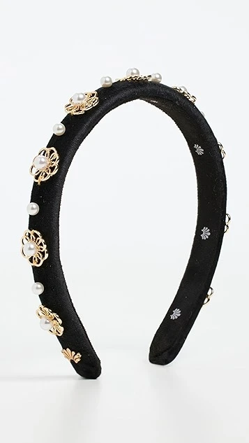 Take your outfit in a romantic direction with this Lele Sadoughi headband, which sets faux pearls and floral hardware against soft and shimmery black velvet.