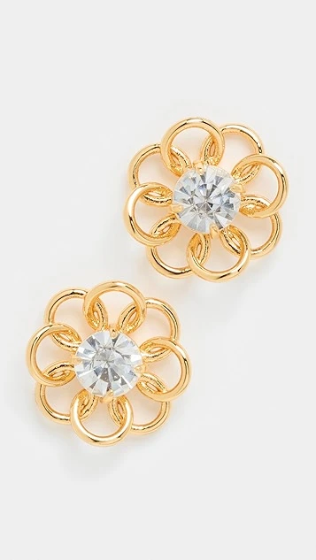 A charming pair of gold tone Lele Sadoughi earrings, featuring a delicate floral motif and bright crystals at the center.