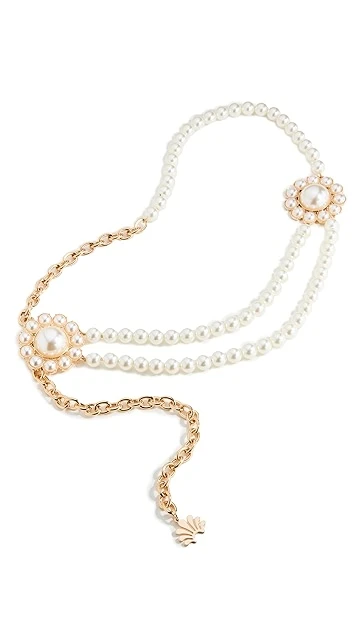A double-layered Lele Sadoughi belt that’ll add a touch of elegance to any look, featuring a mix of imitation pearls and gold-tone links.