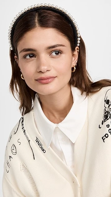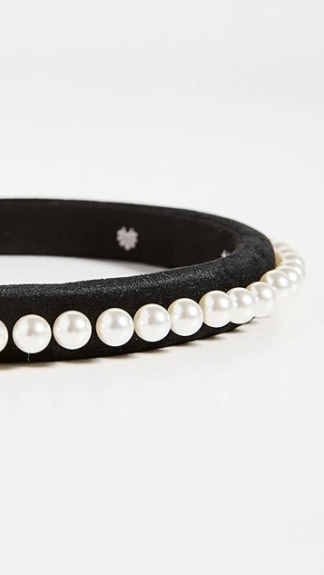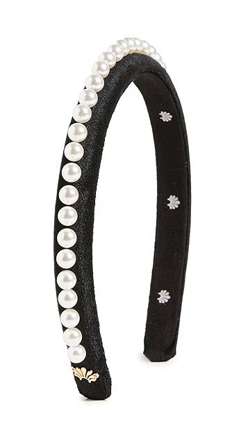 Slim and elegant, this Lele Sadoughi headband juxtaposes soft black velvet with a row of classic imitation pearls.