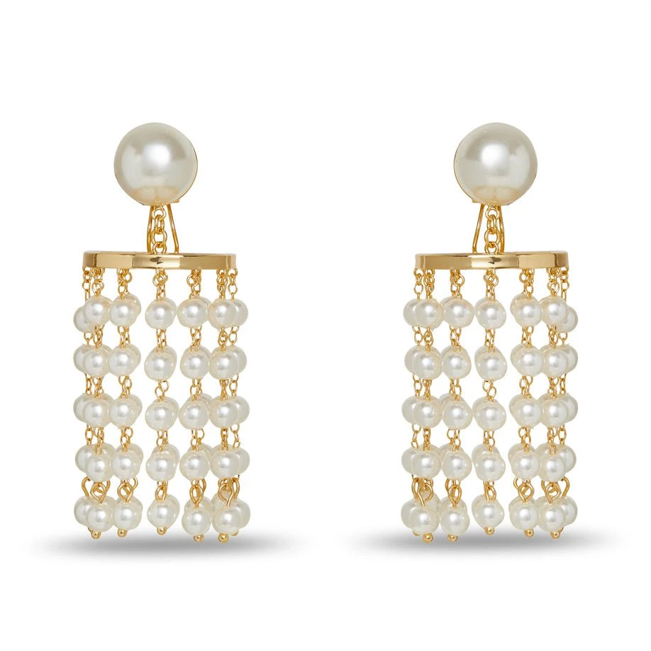 ∙ Strands of dangling faux pearls suspended from a 14k gold plated ring attached to a faux pearl post