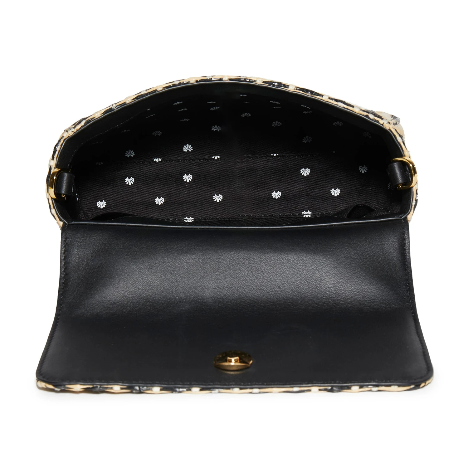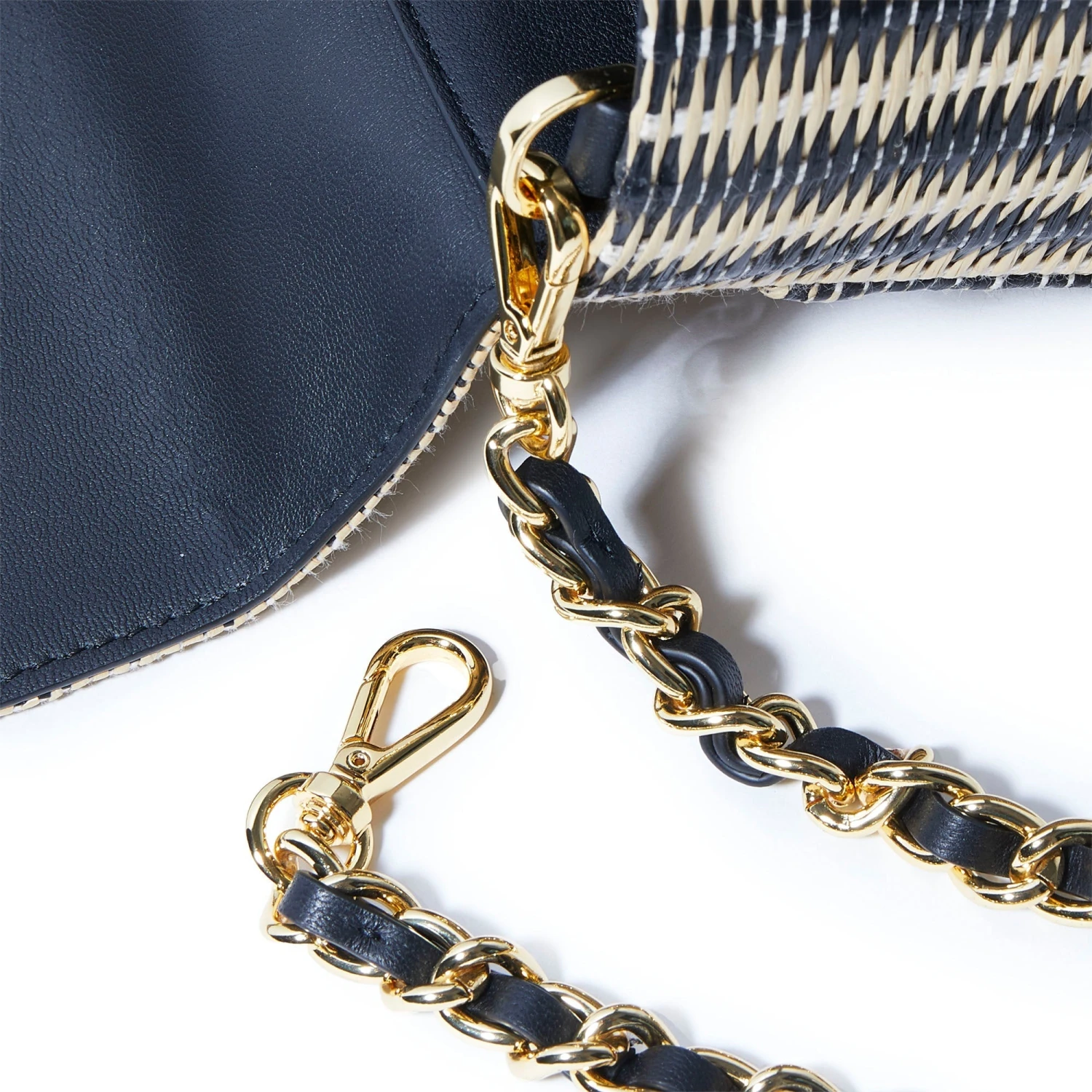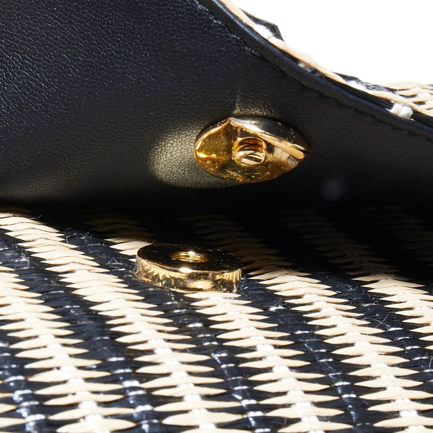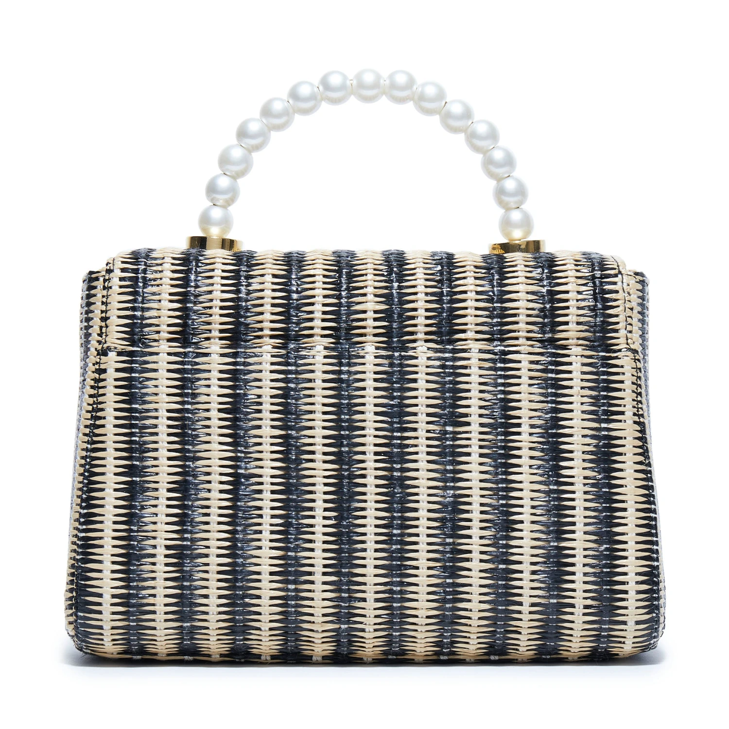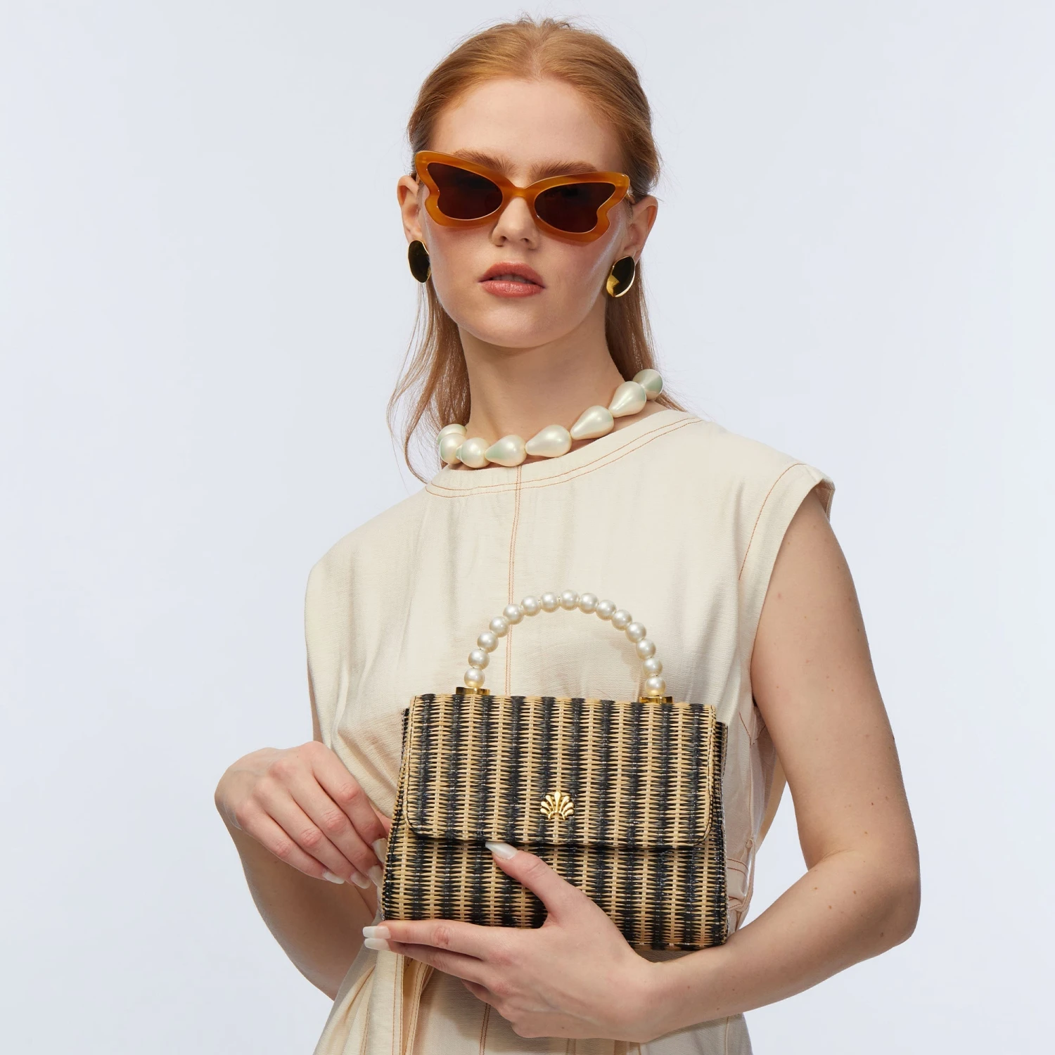 Our leather Tabitha Top Handle Bag, featuring woven raffia.