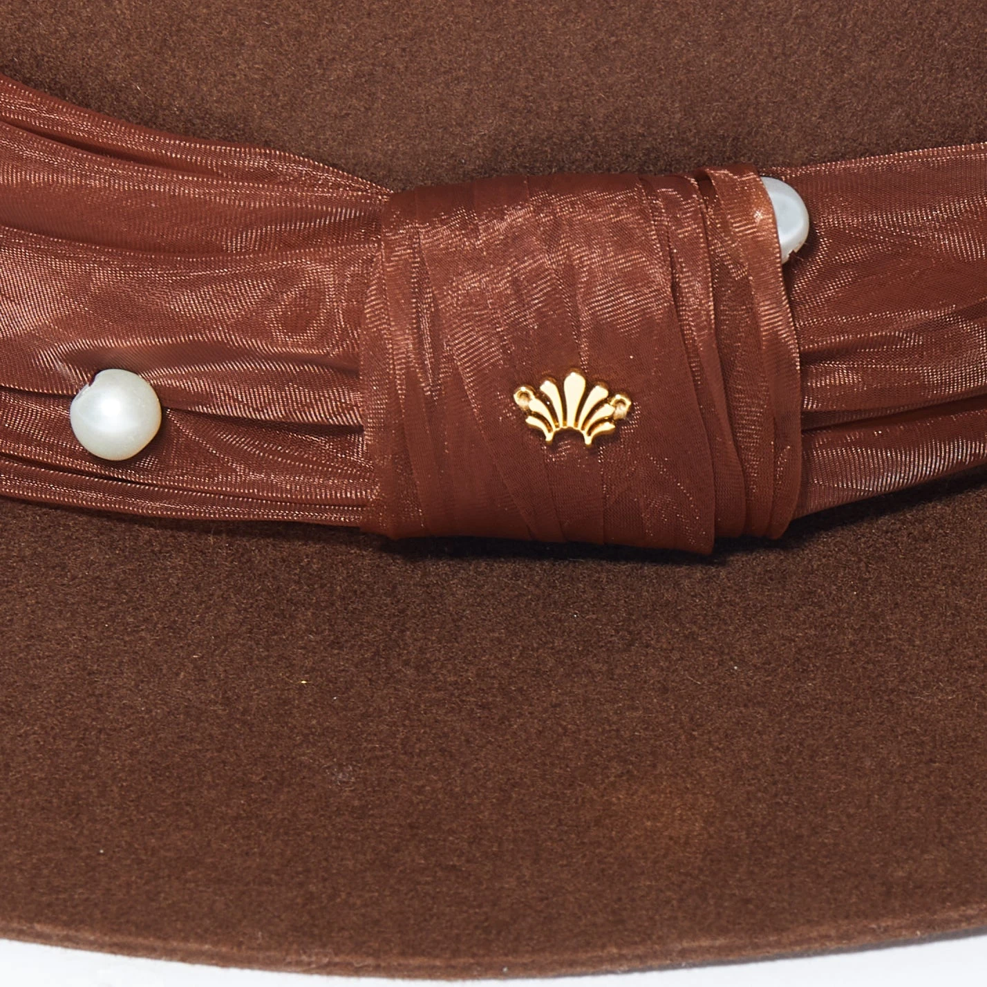 ∙ Featuring a walnut poly silk organza hat band with hand sewn faux pearl embellishments